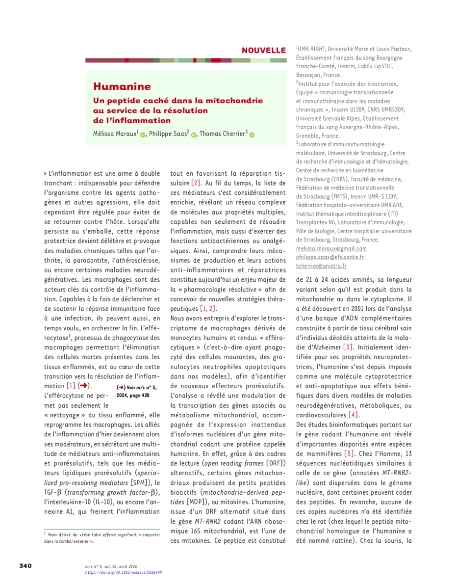Un peptide caché dans la mitochondrie au service de la résolution de l’inflammation
